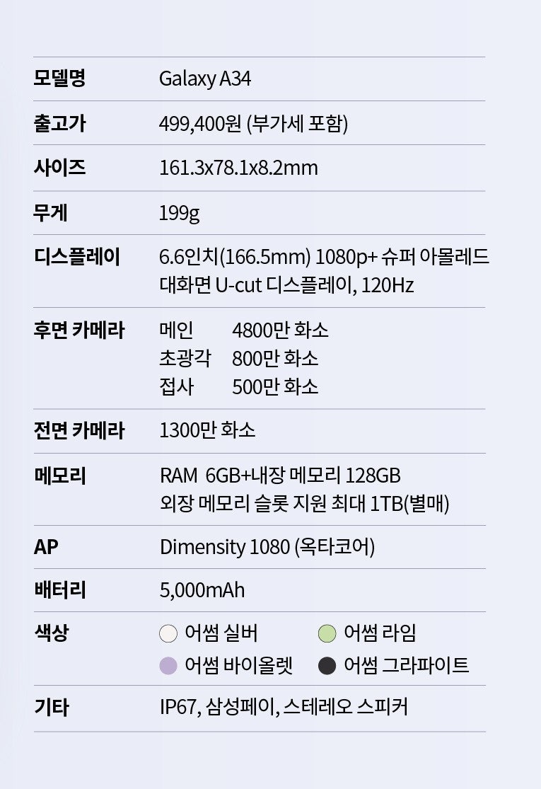 무료 스마트폰을 원하지만 스펙을 포기하기 어렵다면 갤럭시 A34를 추천한다. 갤럭시 A34에는 Dimension City 1080 프로세서와 6GB 메모리 RAM이 탑재되어 있습니다. 대만산 생소한 보급형 프로세서임에도 불구하고 저렴한 가격에 비해 괜찮은 기본사양을 보여주고 있다.