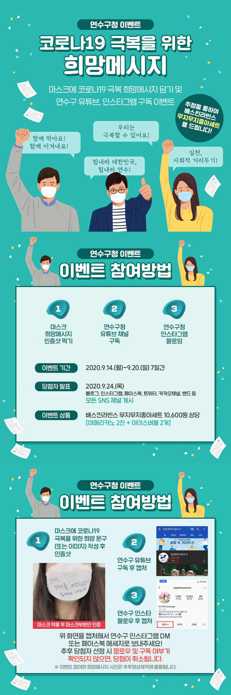 이벤트명 : 2024년 희망의 메시지를 적어주세요~ SNS채널 구독 이벤트 참여기간 : 2023. 12. 5.(화) ~ 12. 15.(금) 관심있는 누구나 참여 가능 참여방법 : 구글폼 제출 희망 메시지 작성 및 채널 구독 인증(캡처사진)(해당 URL) https://forms.gle/tFeRnFbSpoa9ELNh8 당첨자 발표 및 경품 전달 – 추첨 인원 : 총 100명 – 추첨 방법 : 랜덤 추첨 이벤트 참여기준 충족자 중 – 당첨자 발표 : 2023년 12월 20일(수) 종로구 SNS 채널 공지 및 개별 연락 경품방법 모바일 해피콘 1만원 쿠폰 (1인 2매) 【당첨자 선정 시 주의사항】 · 중복 개인정보에 따른 당첨자는 인정되지 않습니다. , 1턴 1승 원칙 · 비정상적이거나 불법적인 방법으로 이벤트에 응모한 경우 적발 시 당첨이 취소됩니다 · 부정확한 정보를 입력하거나 정보를 입력하지 않은 경우 이벤트 참여자 본인의 책임 · 상황에 따라 경품 지급 모바일 배송업체의 동일 금액의 다른 상품으로 결제가 변경될 수 있습니다. 이벤트 일정은 신청 상황에 따라 변경될 수 있습니다. 문의 : 종로구홍보과 02 – 2148 – 1683, 1685