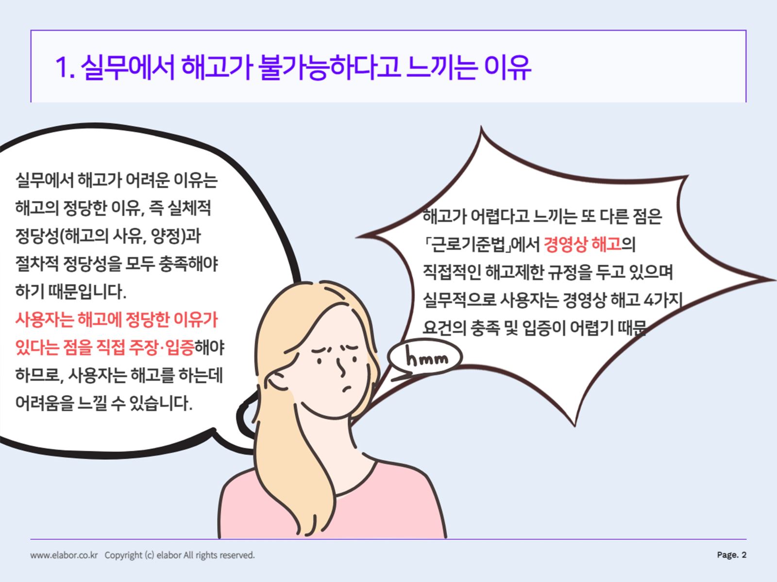 민생을 위해 열심히 일하면 사업이 번창하고 취업도 되고 세금도 내고 사회인으로서 적지 않은 기여를 하게 된다. 어려움을 겪을 때 가장 먼저 해야 할 일은 적은 인원이라도 인원을 줄이는 것이다. 구조조정은 중소기업에서 대기업에 이르기까지 가장 빠르고 쉬운 일이기 때문에 미래의 불확실성을 예상하는 사업주 입장에서는 불가피한 선택이기도 하다. 그러나 노동법이 강화됨에 따라 채용 및 해고 시 법적 규제를 철저히 준수함으로써 노사간 소송 등의 불이익을 사전에 예방할 수 있습니다.
