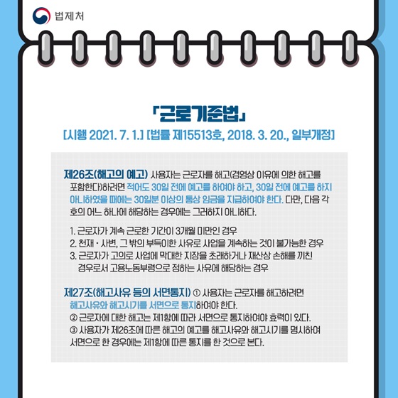 근로기준법 제26조(해고예고) 사용자가 근로자를 해고(사업상 이유 있는 해고를 포함한다)하려면 30일 이상의 해고예고를 하여야 합니다.다음 각 호의 어느 하나에 해당하는 자(2010.6.4, 2019.1.15 개정) 1. 근로자의 계속 근로시간이 3개월 미만인 경우 2. 천재지변, 사고, 기타 사업을 계속할 수 없는 사유 사업에 중대한 지장을 초래하거나 기물을 파손한 경우로서 고용노동부장관이 정하는 사유에 해당하는 경우