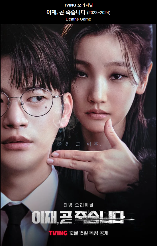 타고난 재벌 3세 태강그룹의 둘째 아들 박진태(최시원), 박태우의 남동생 송재섭(성훈), 익스트림 스포츠 선수 권혁수(김) 강훈), 17세 고등학생 이주훈(장승조), 비밀조직 해결사 조태상(이재욱), 무술선수 지망생 장건우(이도). 현) 남다른 존재감의 모델 (드라마 원작 캐릭터) 이지수(고윤정) 소설가. 최이재의 여자친구 이재의 죽음 이후, 그는 장건우(이재의 환생) 규철(김재욱), 천재 화가, 섹시하지만 잔인한 예술가 안지형(오정세), 형사를 만난다. 김현수(김성철), 최이재의 친구 이진상(유인수), 권혁수. 같은 반 방송사 막내 PD 이재(려운)가 곧 세상을 떠난다. 드라마 예고편을 보면 깨끗하게 죽고 싶었던 최이재에게 사형이 선고됐다. 이재는 12번 죽고, 어떤 몸으로 깨어나더라도 무조건 죽는다고 한다. 노력에 따라 다른 삶을 살 수 있고, 죽음을 피하면 남은 생애를 그 몸으로 살 수 있다고 한다. 이재가 기회로 죽을 수도 있다. 이 게임에서 살아남을 방법을 찾아야 합니다. 죽음이 우리를 이렇게 형벌하는 것은 우리가 죽음의 고통을 느낄 수 있도록 하는 것 같습니다. 자기 앞에 찾아오는 죄라고 합니다. 죽음 이후에 오는 유일한 심판은 또 다른 죽음입니다! 스스로 죽음을 선택한 사람은 고통의 무게를 견뎌냅니다. 죽음은 끝이 아니라 시작이다. 이런 대사와 상황을 보면 드라마의 시작이다. 그 메시지는 자살예방 캠페인에 가까운 것 같습니다. 느와르, 로맨스, 액션, 판타지 등 다양한 장르와 특별 배우들의 열연이 더해져 흥미진진한 드라마가 나올 것으로 보인다. 웹툰을 원작으로 한 드라마