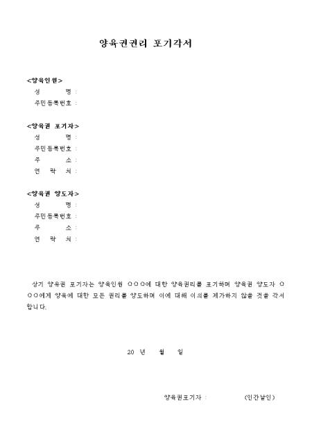 A씨는 결혼 당시 전업 주부였는데 이혼 당시 경제적 여력이 없어 양육권을 포기하겠다는 각서를 썼다. 하지만 이혼 후 직장을 구해 열심히 일했고 지금은 아이들을 키울 수 있는 환경을 만들었다. A씨는 양육권 포기를 철회하고 아이를 다시 데려올 수 있을까? 후견인은 미성년자녀의 권리이자 의무이므로 권리자의 부모라도 포기할 수 없으며 각서를 작성하여 포기 의사를 표시하면 포기하더라도 무효가 됩니다. 각서가 공증되면 어떻게 됩니까? 차이가 있습니까? 공증도 마찬가지입니다. 후견 포기의 의사는 무효이며, 공증의 효력을 주장할 수 없으므로 A씨는 다시 후견 변경을 신청할 수 있습니다.면접권