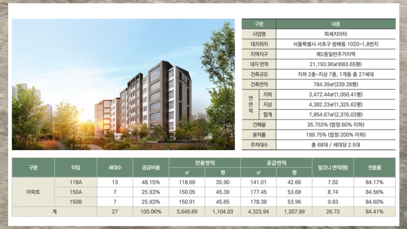 경기침체가 계속되는 가운데 학군이 우수하고 유명 학원이 밀집된 지역에는 내집 마련을 원하는 사람들이 꾸준하다. 오늘은 학부모님들의 꾸준한 관심을 받고 있는 방배파세지아타의 건축개요를 살펴보겠습니다.