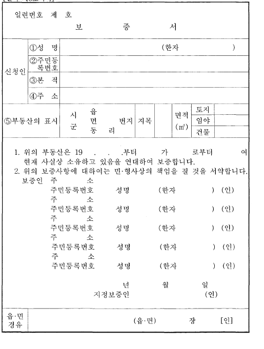 부동산특별조치법은 복잡한 부동산 소유권 문제를 단순하게 해결하기 위해 만들어졌다. 특히 과거 농촌지역 부동산 등 등기상황과 실소유주가 다른 경우에 한시적으로 시행됐다. 소유권보전등기가 없는 부동산권리관계나 실체권리관계에 부합하지 않는 등기를 선별하기 위한 목적이다. 예를 들어 농지, 임지, 씨족재산, 농어촌 상속재산 등의 경우 등기관계가 명확하지 않은 경우가 많았다. 그래서 예전에는 부동산을 구입했지만 소유권을 이전할 수 없었고, 매매계약도 맺지 않은 경우가 많았습니다. 이러한 문제를 해결하기 위해 법률이 제정되어 누구나 쉽게 등록할 수 있게 되었습니다. 한시적으로 시행되었기 때문에 2007년까지만 가능했고 현재는 폐지되었습니다. 프로세스가 얼마나 간단하고 간소화되었는지 살펴보겠습니다. 등록요건 : 소정의 요건을 갖춘 3인 이상의 보증인이 작성한 보증서 제출