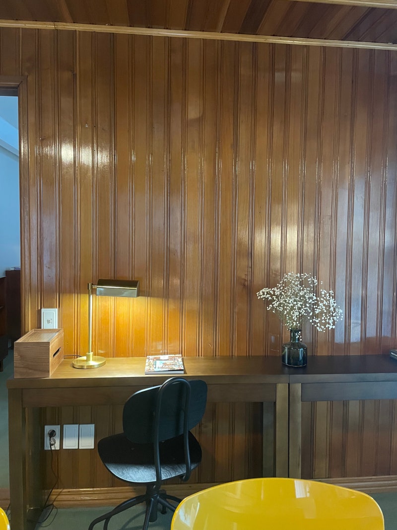 모든 공간에 인테리어가 낭비되지 않았습니다. 노란색 조명은 이런 장소와도 잘 어울리는 것 같아요. 입구에서 왼쪽을 보면 주방이 보이나요? 직원분이 계시고, 여기서 커피도 주문하실 수 있어요. 거실에 있는 긴 테이블은 낙서를 하고 고민을 적어두는 공간 같은 느낌이었어요.