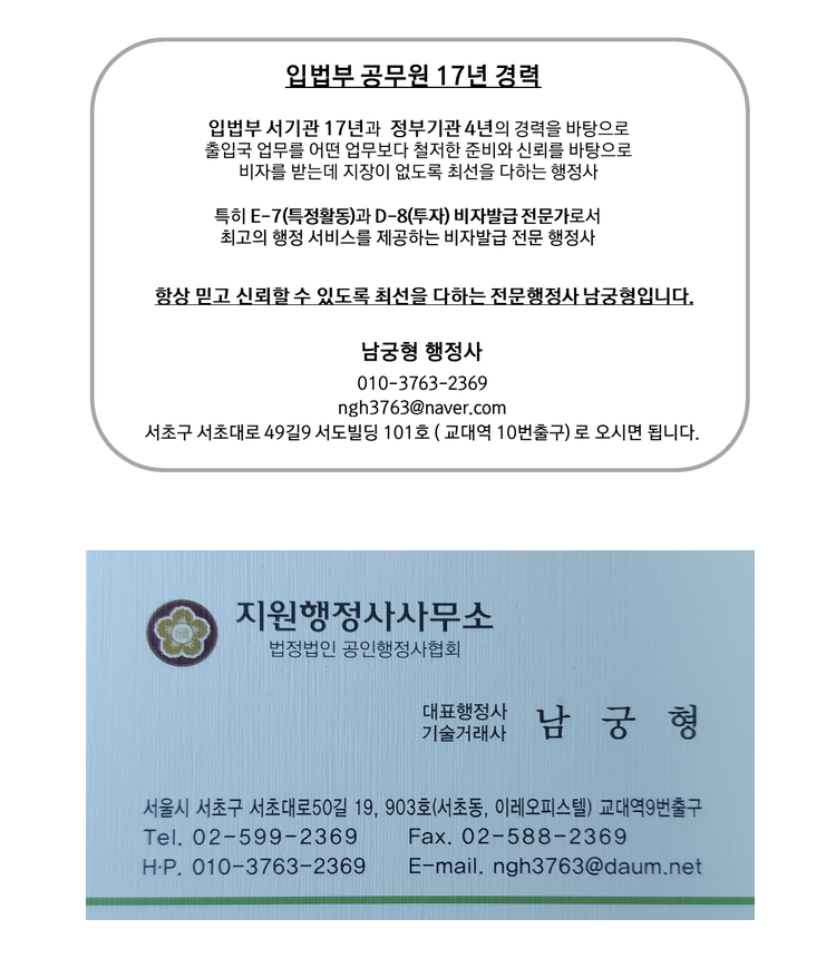 배우자, 가족보육초청, 보육비자 F-1-5 대한민국 국적을 가진 한국인 배우자, 결혼이민자, 영주권자(F5)는 보육지원을 위해 가족초청비자를 신청할 수 있습니다. 한국인 배우자가 사망하거나 양육권을 갖고 자녀를 혼자 키우는 경우 가족 구성원을 한부모가족으로 초청할 수 있습니다. 외국인 배우자의 부모 중 어머니가 우선이고, 아버지가 나중에 초대됩니다. 아버지를 초대한다면 어머니를 초대하지 않는 이유를 설명하는 것이 좋습니다. 형제자매도 이 비자를 받을 수 있으나, 시아버지, 시어머니, 시아버지, 시어머니 등 부모가 입국할 수 없는 부득이한 사유가 있는 경우, 초대받은 외국인에게는 미성년 자녀가 없어야 합니다. F-1-5 비자 초청 요건은 다음과 같습니다. 초청 횟수: 자녀 1인당 최대 2회(부모 개별 적용) 초청 횟수: 1회, 단, 부모만 동시에 신청 가능(동시 신청 가능) 부, 모가 국내 체류 중인 경우, 결혼이민자의 부모 등 다른 가족은 초청할 수 없음) 결혼이민자의 부, 모(부모 모두 입국이 불가하고 초청 대상자에게 미성년 자녀가 없는 경우) , 형제자매, 이전 결혼에서 태어난 자녀가 초대 대상이 됩니다. 부모가 아닌 형제자매를 초대하는 경우 부모 중 어느 쪽도 입국을 허용해서는 안 된다는 말이 모호할 수 있다. 구체적으로, 부모 모두 사망, 질병, 60세 이상 등의 사유로 입국할 수 없는 경우에는 그 사유를 설명하고 증빙서류를 제출해야 합니다. 양육권 지원 서류의 경우, 후원자 한국인 배우자의 입장에서 발급되는 서류도 있지만, 자녀를 기준으로 반드시 발급해야 하는 서류도 있다는 점 참고하시기 바랍니다. 또한, 비자서류와 함께 현지 가족관계 입증서류, 호구부 등의 서류를 제출해야 하며, 신청자 또는 가족관계를 입증할 수 있는 가족에 한해 재외공관이나 재외공관을 방문하여 신청해야 합니다. F-1-5 비자는 자녀 양육을 목적으로 한 초청이므로 취업이 불가능하며, 신청 시 비취업 서약서를 반드시 제출해야 합니다. 불법 취업을 할 경우 향후 가족초청이 제한되므로, 취업 목적으로 가족초청을 생각하고 계시다면 취업비자를 살펴보는 것이 좋을 것 같습니다. 부모, 형제자매, 가족초청을 위한 C3비자 자녀가 없더라도 모국에서 가족을 초대하여 함께 머물고 싶어하는 분들이 많을 것입니다. 불법체류의 위험이 있으므로 자녀양육비자 등 장기초청은 불가능합니다. 다만, 단기가족방문초청비자는 가능합니다. 허가를 받으면 90일 이내의 짧은 동거도 가능하기 때문에 자주 만나 가족초청 멀티비자를 받고 싶어하는 분들도 많습니다. 다만, 복수사증의 경우 본국 예금잔고 증명서 등 외국인에 대한 요건이 까다롭기 때문에 반드시 확인 후 진행하시기 바랍니다. 베트남, 중국, 태국, 몽골 등 불법체류가 빈번한 국가에서는 C3 단기비자를 받기가 쉽지 않다. 가족이 한국에 체류하고 있더라도 불법취업이나 불법체류의 가능성이 높기 때문에 기간에 맞춰 체류하고 귀국할 수 있도록 보장하는 것이 필요합니다. 단기초청비자 서류는 국가에 따라 필요한 서류가 다릅니다. 여행 계획 제출을 요구하는 국가도 있고, 반품 보증서 제출을 요구하는 국가도 있으며, 각 국가마다 형식이 다릅니다. 베트남 등 일부 재외공관에서는 부모초청 비자를 발급받을 수 있지만, 어떤 곳에서는 결혼식이나 장례식 등의 사유가 아닌 이상 형제자매를 초대할 수 없는 경우도 있다. 국가, 지역마다 지침이 다르기 때문에 JM 사무국에서는 많은 비자 신청 사례를 통해 각 재외 대사관의 동향을 파악하고 지침에 따라 서류를 준비하며 추가적으로 초청 이유를 명확하게 설명할 수 있도록 도와드립니다. 우리는 그것을 당신에게 주고 있습니다. 기본적인 서류만 준비하시면 거절될 확률이 높기 때문에 저희 사무실에서 C3비자를 신청하실 때에는 F6비자만큼 많은 서류를 준비하셔야 합니다. 따라서 승인 확률도 높다. 우리 사무실에 단기 비자 신청에 대해 문의하시는 분들이 종종 계시고, 모국의 여행사를 통해 신청하면 비용이 얼마나 되는지, 그곳에서는 서류 수수료가 왜 그렇게 비싼지 물어보십니다. 현지 대리점에서 하는 일은 기본적인 정보 제공과 준비된 서류 제출만 대행하는 것 뿐이지만, 저희만의 노하우로 초청장 및 한국 체류를 보장하는 기타 서류까지 추가로 도와드립니다. 또한, 시간을 절약하기 위해 저렴한 곳에서는 초대 사유 등 모든 서류를 이름만 변경하고 동일한 형식으로 보관하는 경우도 있습니다. 이 경우 초청의사가 불분명하거나 서류가 타인과 동일 또는 유사한 등의 사유로 사증발급이 거부될 수 있습니다. 이는 저희가 지어낸 이야기가 아니며, 실제로 대사관에 공지된 경우가 너무 많습니다. JM 행정실에서는 가족 초대 시 시아버지, 시어머니, 형제, 자매 등 개인의 상황에 따라 초대 사유를 입증할 수 있는 서류에 대해 개별 조언을 드리고 있습니다. 외국인 배우자의 가족후원비자나 보육비자에 관한 상담이 필요하신 분들은 아래 번호로 연락주세요! 50m NAVER Corp.자세히 보기 /OpenStreetMap map datax NAVER Corp. /OpenStreetMap Map Controller Legend Real Estate Street 읍 구시군 동시 도청 JM 관리청 서울시 종로구 