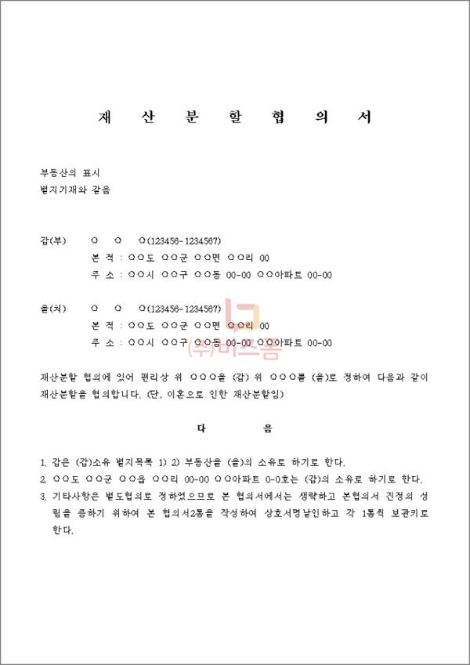 1) 재산분할 부부 각자의 재산뿐만 아니라 부채까지 기록하고, 어떻게 분배할지 명시합니다. 중요한 것은 ‘고유재산’이다. 혼인 전에 창출된 재산, 증여 또는 상속받은 재산을 말합니다. 결혼 전 본인이 구입한 재산이 있거나, 부모로부터 부동산을 증여/상속받은 경우에는 배우자와 공유할 필요가 없으므로 꼭 기억해두셔야 합니다. 때로는 고유재산을 나누어야 한다고 생각하고, 나눈 후 나중에 다시 찾아오시는 분들도 계십니다. 이러한 일이 발생하지 않도록 주의하시기 바랍니다.
