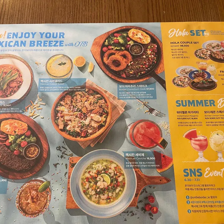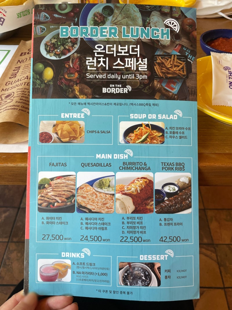 멕시코 음식 하면 가장 먼저 떠오르는 것이 온더보더(On the Border)이다. 자주 발생하지는 않지만 타코, 퀘사디아 등 특별한 멕시코 음식을 먹고 싶을 때면 언제나 온더보더(On the Border)가 대명사로 떠오른다. 저는 옛날부터 온더보더(On the Border)에 자주 가곤 했어요. 오랜만에 LTO 가을시즌 메뉴를 먹으러 코엑스 레스토랑에 왔습니다. 보더 코엑스 시티공항점에 가보니 늘 그렇듯 나초, 타코, 코로나리타(온더보더 가면 100ㅋㅋㅋ), 계절 메뉴, 멕시칸 머슬 포솔레, 망고 쉬림프 타코가 있었어요. 모든 것이 너무 맛있었습니다. 고수를 자주 먹지 않는데도 온더보더 메뉴와 정말 잘 어울려요.