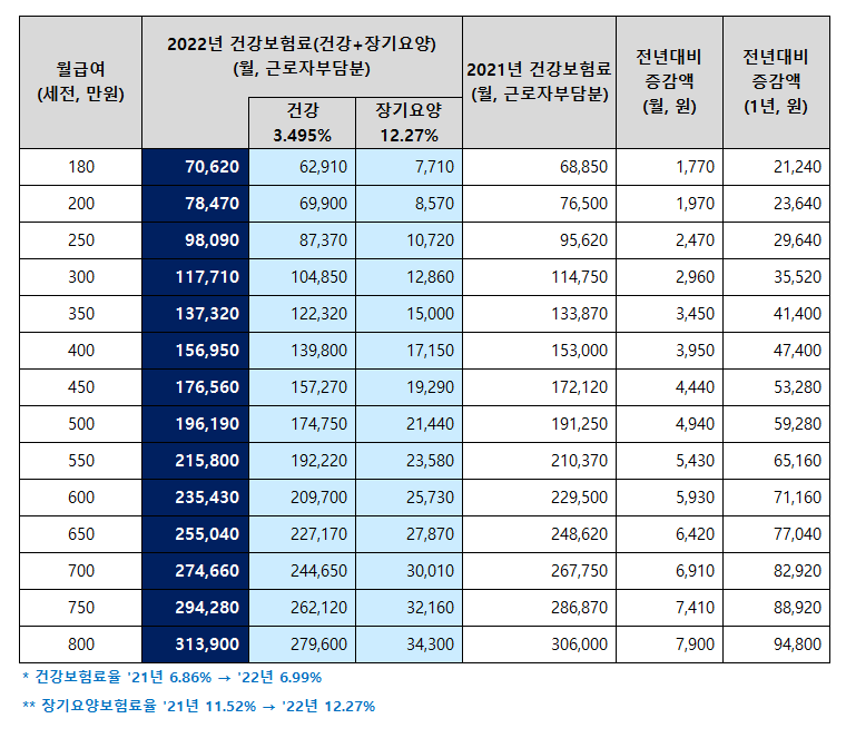 2023 4대 보험료 구분 20222023 연금보험 9% 9% 4.50% 4.50% 건강보험 6.99% 7.09% 3.545% 3.54% 장기요양보험 12.27% 건강보험료의 12.81% 고용보험 1.80% 1.80% 0.90% 0.90% 산재보험업에 따라 다름
