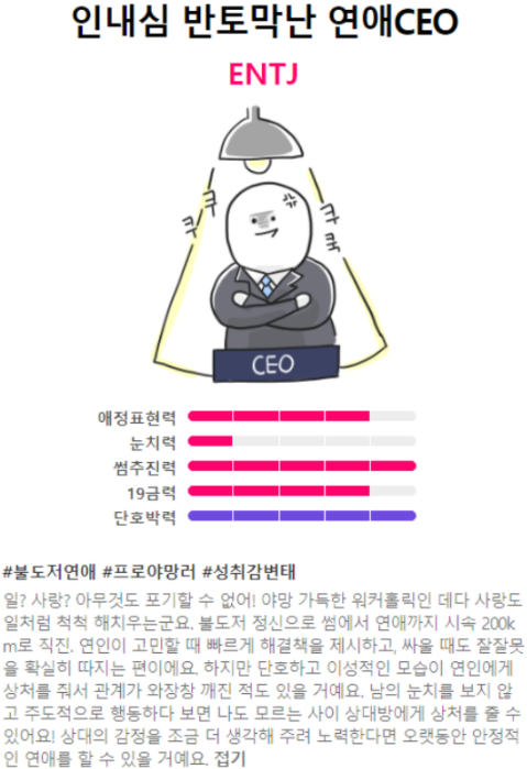 우선, 여러 유형 중 ENTJ 여성은 대담한 리더라고 불리는 MBTI 유형이다. 별명만 들어도 느껴지시죠?