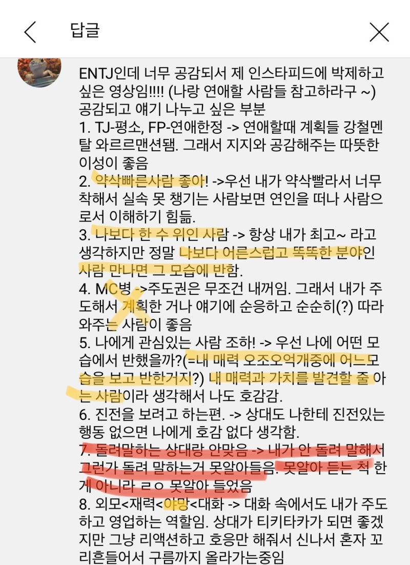 1. 대담하고 독립적인 성격 엔티지 여성은 확고하고 강한 의견과 생각을 가지고 있습니다. 그래서 이러한 점들 때문에 자신이 고집이 세고 다른 사람의 의견을 받아들이지 않는다는 느낌을 받을 수도 있습니다. 당신이 말하는 모든 것이 옳다고 느끼는 것과 비슷합니다. 그만큼 재능이 있고 실제로 모든 일에 능숙한 유형의 사람들이 많이 있습니다. 많이 있습니다. 2. 목표지향적, 계획적! 사람들은 목표를 설정하지만 그것을 달성하는 사람은 많지 않습니다. 하지만 그런 말은 ENTJ에게는 적용되지 않습니다. 그렇다면 왜 목표를 설정하는가? 그들은 다른 사람들을 이해하지 못합니다. 그것이 그들이 계획한 방식입니다. 그들은 목표 지향적이며 자신이 수립한 루틴이나 계획에 따라 안정적으로 행동합니다.3. 뛰어난 리더십 대담한 리더답게 엔타이즈 여성들은 리더십이 뛰어납니다. 리더라는 영광이 싫지만, 해달라고 하면 누구보다 잘하는 사람들이다. 4. 완벽주의와 재능을 겸비한 인기 여성들이 많고, 실제로 모든 면에서 완벽주의 성향을 갖고 있다. 멋진 사람들이 많은데, 아마도 미라클 모닝에 참여하고 자신을 보호하는 데 능숙한 MBTI 유형의 대부분을 차지할 것입니다. 자기관리와 자기관리가 뛰어난 분들이 많이 계십니다. 사람을 잘 챙겨주기 때문에 많은 사람들이 나를 따라온다. ENTJ 여성의 특징을 요약하면 완벽주의, 철저한 계획, 뛰어난 리더십을 갖춘 인기있는 사람들이다. 사실 친한 ENTJ 지인들은 다 배우같고 일도 잘하는 편이에요. 하지만 INFP인 저는 잘 이해가 되지 않습니다. 나는 조금 좌절감을 느낀다. ㅎㅎㅎ ENTJ 연애스타일! 이런 완벽주의 ENTJ 연애는 어떤 것인지 궁금하지 않으신가요? 우선, 그들은 종종 자신의 사람들에게 열중하고 올인한다고 느낍니다. 그들은 사교적이지만 자신이 속한 사람들에게 더 많이 집착하는 유형입니다. 여기에 집착한다고해서 끌려 나가는 것은 아닙니다. 그들은 그 사람들과 접촉하는 데 집중하고 그들이 만나는 시간은 그들의 사람들과 함께 있습니다. 나는 모든 사람에게 더 집중합니다. 저는 만인의 연인처럼 보이지만 사실은 자기 사람에게만 집중하는 편이에요. 하지만 공감능력이 부족하기 때문에 극단적인 F남자들은 조금 상처를 받을 수도 있다. allvar, Source Unsplash내 가장 친한 친구 Entize는 100% T입니다… 그게 사실인가요? 그래서 그런 정서적 공감을 느끼지 못할 수도 있지만, 타인과 공감하고 이해하려고 노력합니다. 그런 따뜻함을 느끼는 사람들이에요. 그러나 그들이 그렇게 할 수 없다는 것은 명백합니다. 귀엽게 생긴 소녀들이네요. edge2edgemedia, Source UnsplashStill, 그들은 실용적인 솔루션을 찾는 데 정말 능숙하므로 Entise와 관계를 맺고 있다면 함께 해결해보십시오! 그들은 또한 지적 능력을 채우고 사회적 만남을 좋아합니다. 음악에 관심이 있다면 공연이나 미술 감상에 관심이 있을 수도 있습니다. 그렇다면 전시회 날짜 등을 계획해보세요! 그렇다면 ENTJ 여자는 당신을 좋아할 것입니다. ENTJ 이상형 요약 이번 ENTJ 연애 스타일로 요약된 ENTJ 이상형에 대해 이야기해보겠습니다. Entiges는 말하기 전에 자신이 완벽하기 때문에 기대치가 높고 다른 사람에 대한 기대도 높은 경향이 있습니다. 1. 뇌가 섹시한 남자. 우선 나는 똑똑한 사람을 좋아한다. 지적으로나 직업적으로도 말이죠. 어리석다고 느끼면 OUT이므로 주의하세요! 2. 자신이 하는 일에 최선을 다하고 최고가 되세요! 바로 그 문장이 말하는 것입니다. 머리가 뜨거운 남자와 연결되는 부분인 것 같지만, 멍청하고 무능하다는 느낌은 정말 싫다. 그렇기 때문에 많은 NTJ가 무능하다고 느낄 때 남성으로서의 매력을 잃게 됩니다. 비록 당신이 직장에서 최고가 될 수는 없더라도, 모든 사람은 다른 사람보다 자신의 직장에서 더 잘합니다. 알잖아. 그 점을 어필해 보세요.3. 자기관리는 필수입니다. ENTJ는 자기관리가 뛰어난 MBTI입니다. 그래서 그들은 다른 사람들도 이것을 할 수 있다고 생각합니다. 설령 그렇지 않더라도 왜 이런 일을 하지 않는 걸까요? 마찬가지로 사고 회로도 노력을 기울이지 않습니다. > 무능합니다. > 바보. 이와 같이. 이것이 계속되면서 어느 정도 자기 관리를 실천하시기 바랍니다. 내 가장 친한 친구도 이러한 기능을 표준으로 설치했습니다. 따라서 이러한 기능을 너무 많이 잃지 않도록 주의하시기 바랍니다. 다른 MBTI 유형이 궁금하다면 아래 글을 읽어보세요. ENTJ 여자 특성 궁합과 이상형 BEST 여행 파트너 최고의 여행 파트너 찾기 시리즈에 이어 이번에는 ENTJ에 대한 포스팅을 하려고 합니다. 우선 EN… blog.naver.com INFP 여성의 특성과 여행에 어울리는 바람피우는 방법 요약 우선 오늘의 이야기는 INFP로서 개인적인 생각이 많이 담긴 포스팅이 될 것 같습니다. 억지로… blog.naver.com
